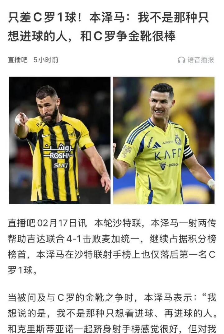 若是C罗认为我方是史上最好,那他就这样认为吧。”——本泽马浅浅地说了这样一句,恶果坐窝在足坛掀翻了山地风云!2025年2月24日,在吉达勾通4-1大告捷雅得月牙的比赛后,这位和C罗一齐为皇马遵守了9年的外传球员,在沙特的媒体眼前扔下了一颗“重磅炸弹”。他不相沿C罗的“史上最好”宣言,径直泄露我方心目中的神是巴西外传球星罗纳尔多。更意料的是,当前这两位球员齐在沙特联赛中厮杀:本泽马以16个进球(不含点球)领跑弓手榜,球队也稳坐头把交椅;而C罗诚然也进了16个球(其中有6个点球),但因为过时11分,只可排在第二。照旧的“绿叶”和“红花”扮装,是不是正在沙特联赛演出一场惊天的大逆转呢?