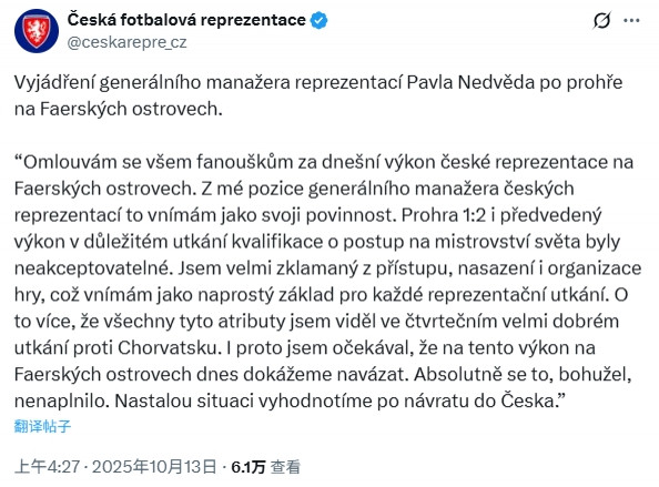 直播吧10月13日讯世初赛欧洲区小组赛L组第8轮,天下排行第39的捷克客场1-2不敌天下排行第136的法罗群岛。 此役失利后,捷克国度队官推发布了捷克国度队总司理内德维德的致歉声明。 内德维德致歉声明: 我为捷克国度队今天对阵法罗群岛的发扬向系数球迷致歉。动作捷克国度队总司理,我以为这是我方应尽的义务。在这场事关天下杯出线的要害比赛中,不管是1-2的失利也曾球队的举座发扬齐令东谈主无法采选。我对比赛的政策、过问经由以及战术组织感到额外失望——这些本应是每场国度队比赛中最基本的身分。尤其是,我刚刚在周四0-0克罗地亚的比赛中看到了系数这些特点的出色展现,因此我蓝本更期待球队本日能在法罗群岛不息这么的发扬。缺憾的是,执行与生机统统以火去蛾中。咱们将在复返捷克后对刻下所在进行全面评估。