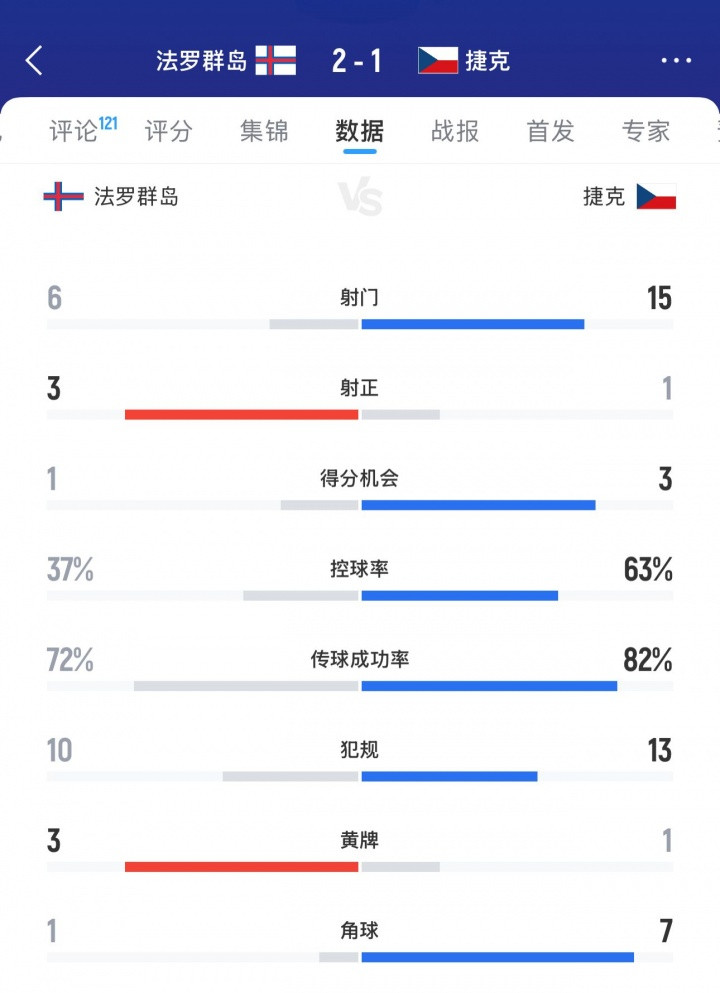 数据方面,捷克15次射门仅1次射正进1球、控球率63%,法罗群岛6次射门3次射正打进2球、控球率37%。