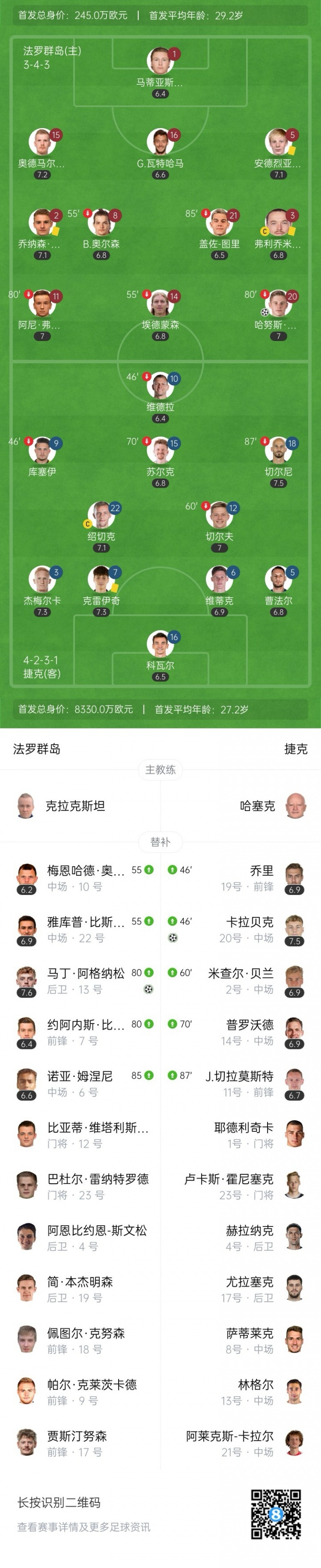本场比赛,法罗群岛首发身价仅245万欧,而捷克首发身价高达8330万欧,是敌手的34倍!