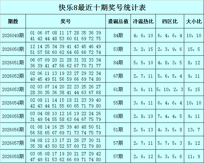 福彩称心8第2026058期开奖纪念:03 05 08 17 19 20 21 27 29 42 47 49 51 53 62 66 69 71 74 80,其中奖号遗漏总值为57,冷温热码比为2:6:12,四区比为6:3:5:6。