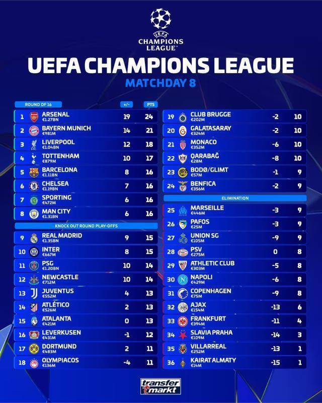 纵贯16强球队(1-8名):阿森纳、拜仁慕尼黑、利物浦、托特纳姆热刺、巴塞罗那、切尔西、里斯本竞技、曼城