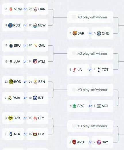 附加赛种子队(9-16名):皇家马德里、外洋米兰、巴黎圣日耳曼、纽卡斯尔联、尤文图斯、马德里竞技、亚特兰大、勒沃库森